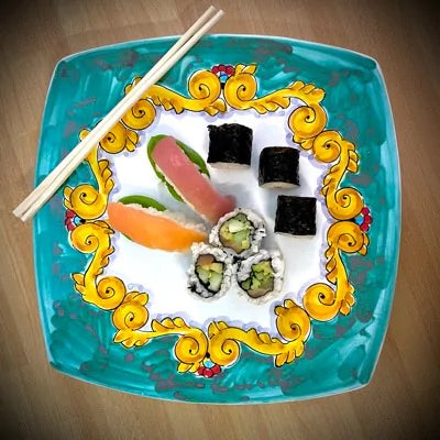 Piatto sushi- Ad ogni tua splendida creazione in cucina, il piatto che meglio la valorizza. Questo mese ti proponiamo un omaggio alla cultura giapponese che incontra il mediterraneo, un piatto ideato per il sushi con decori vietresi. Sorprendi i tuoi ospiti con cene a tema.