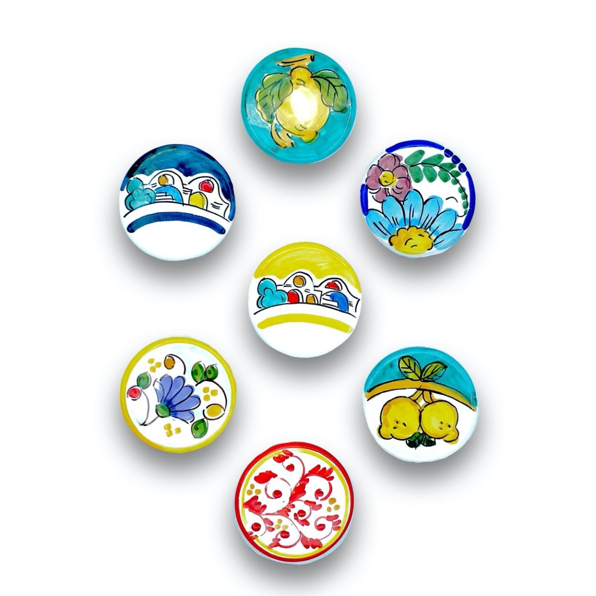 Dischetto in ceramica vietrese decorato con piccolo magnete, realizzato a mano da esperti artigiani italiani, il cui lavoro minuzioso rende unica e preziosa la realizzazione di ogni singolo dettaglio.