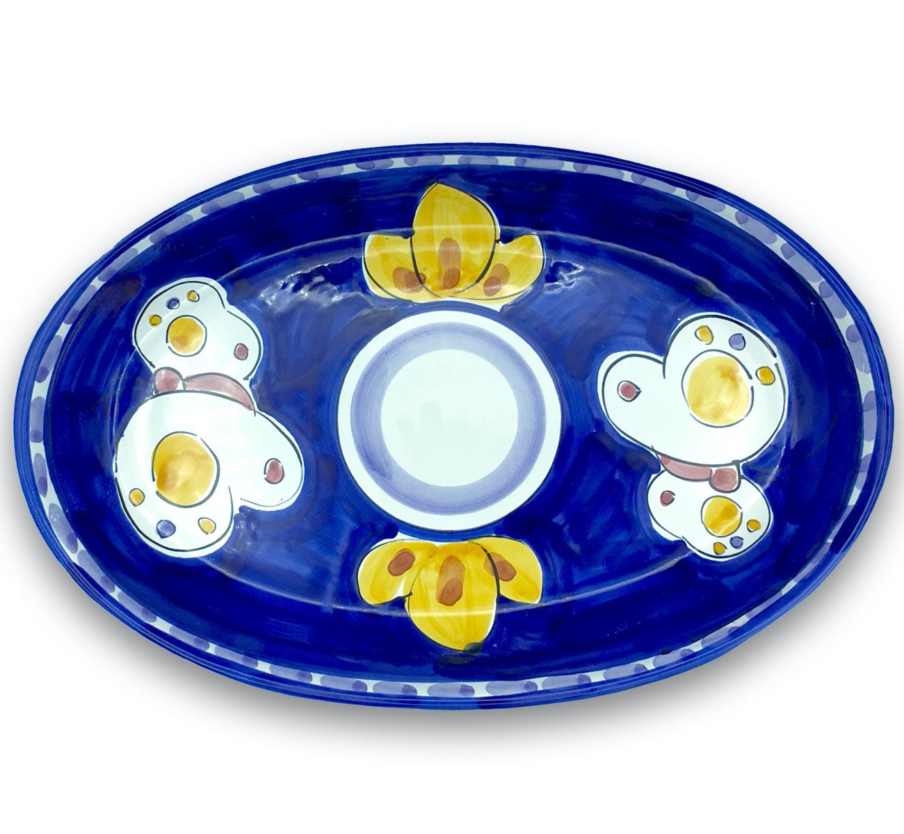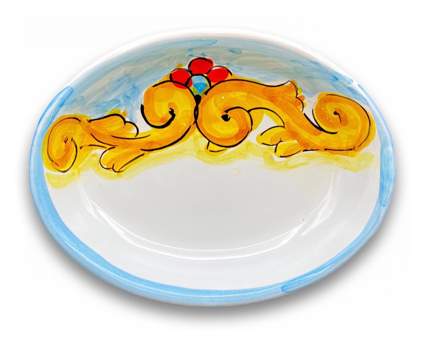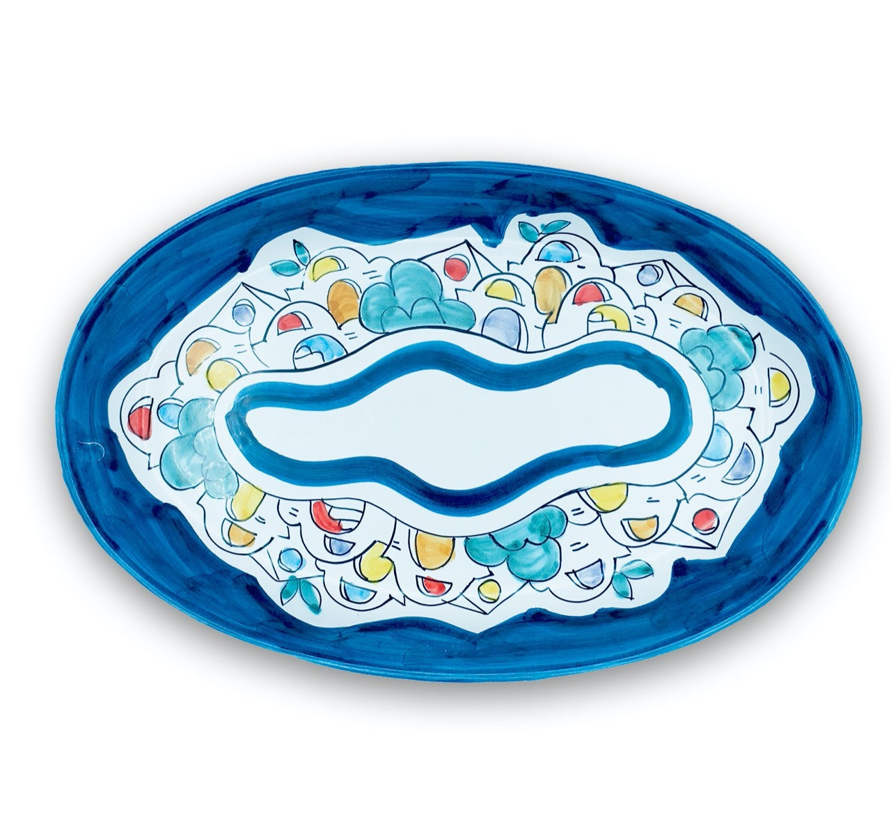 Piatto ovale in ceramica vietrese interamente decorato a mano da esperti artigiani italiani, il cui lavoro minuzioso rende unica e preziosa la realizzazione di ogni singolo dettaglio.