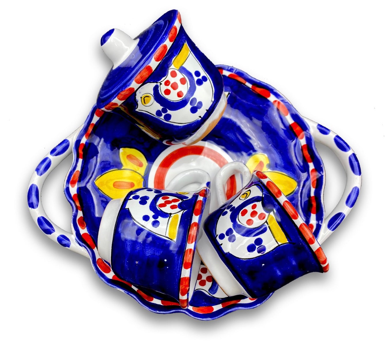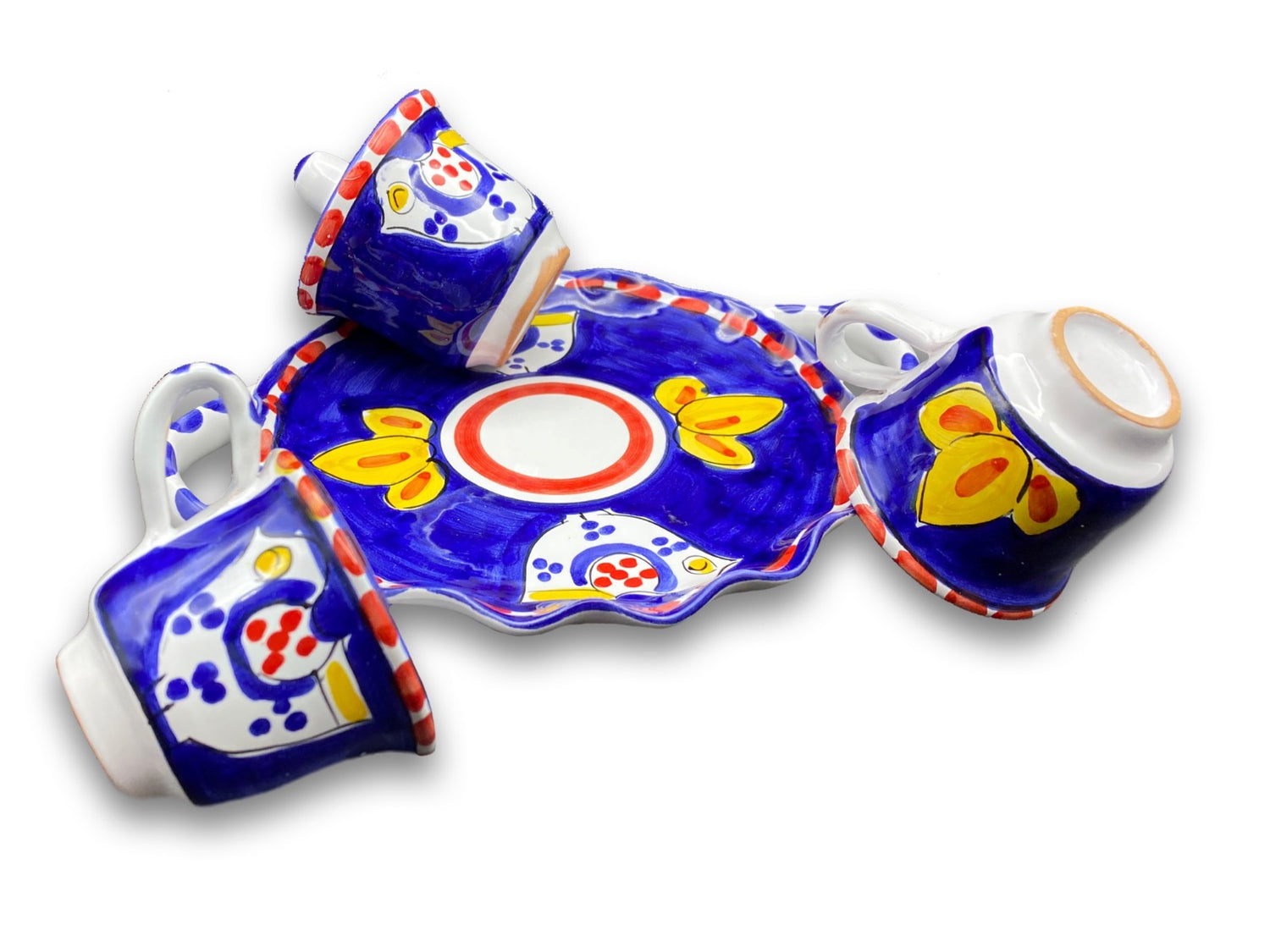 Set composto da due tazzine da caffè con vassoietto e zuccheriera abbinati in ceramiche di Vietri, tutto realizzato e decorato interamente a mano da esperti ceramisti italiani.