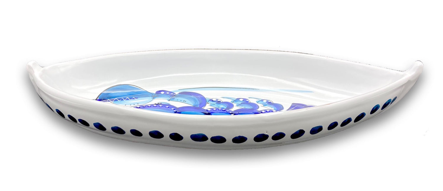 Barchetta in ceramica vietrese perfetta per essere utilizzata come svuota tasche o come ciotola per i tuoi contorni e aperitivi, interamente decorata a mano da esperti artigiani italiani, il cui lavoro minuzioso rende unica e preziosa la realizzazione di ogni singolo dettaglio.