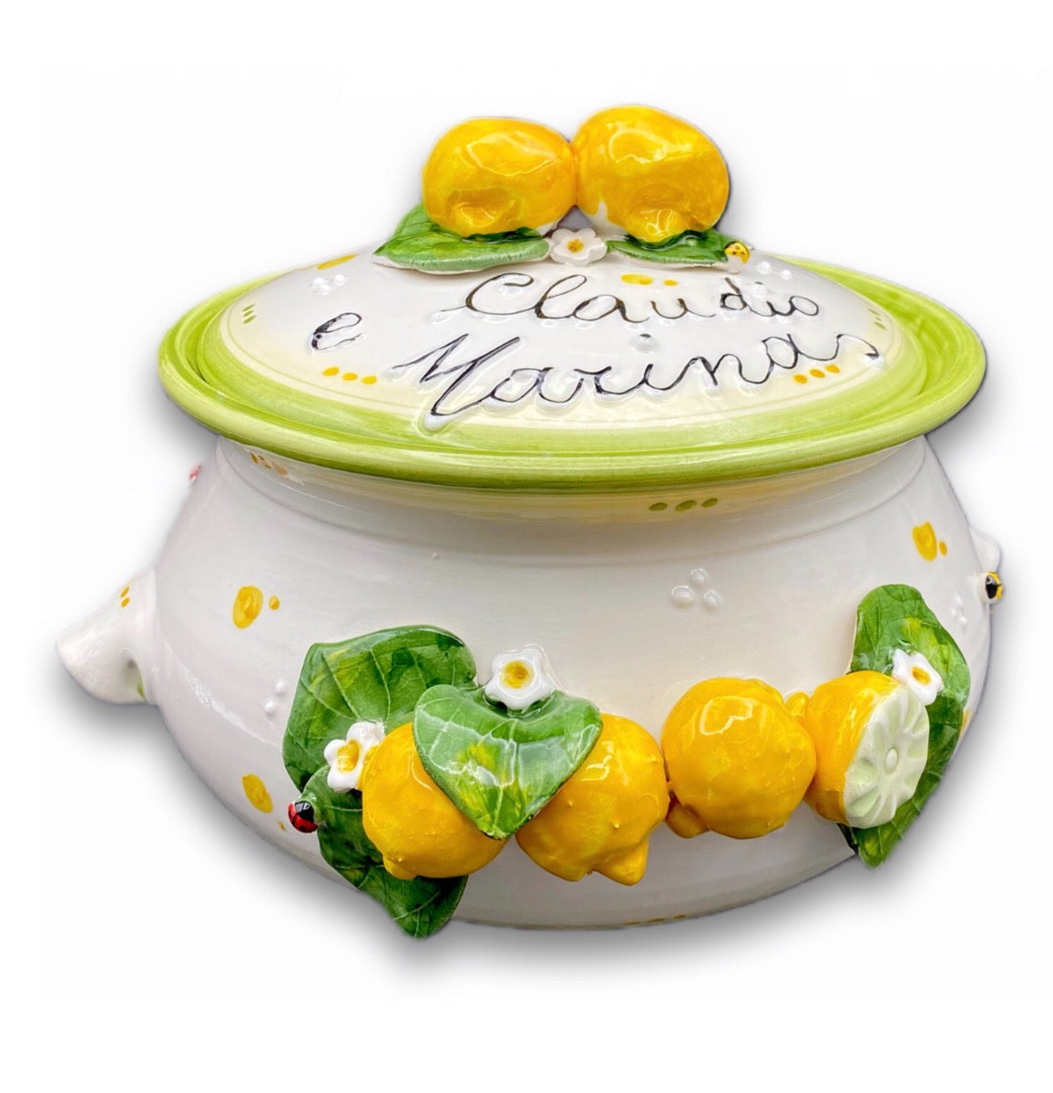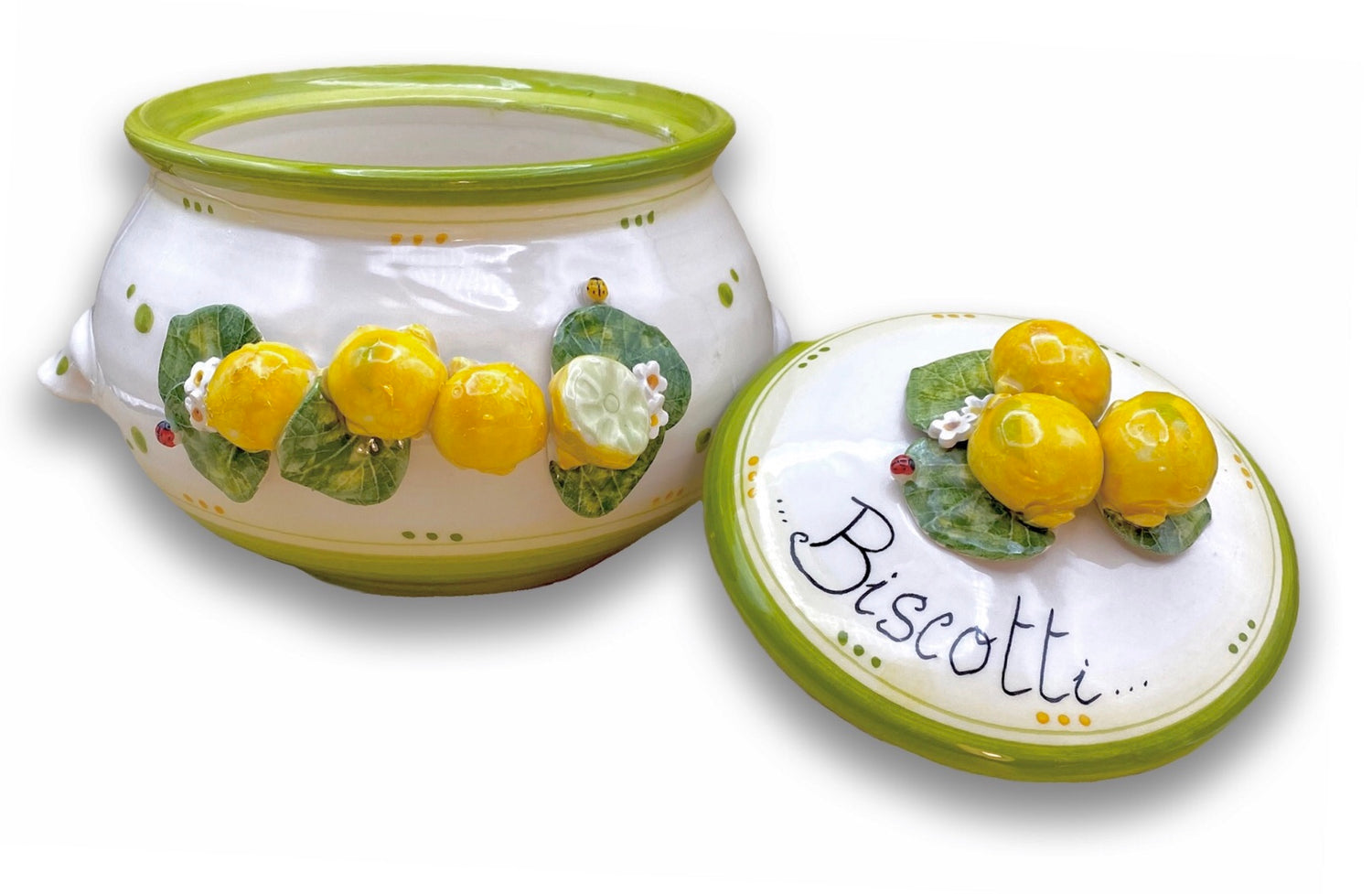Biscottiera in ceramica vietrese svasata con coperchio, perfetta per contenere biscotti o cereali, realizzata a mano grazie alla maestria di artigiani ceramisti che fanno del “made in Italy” la loro passione.