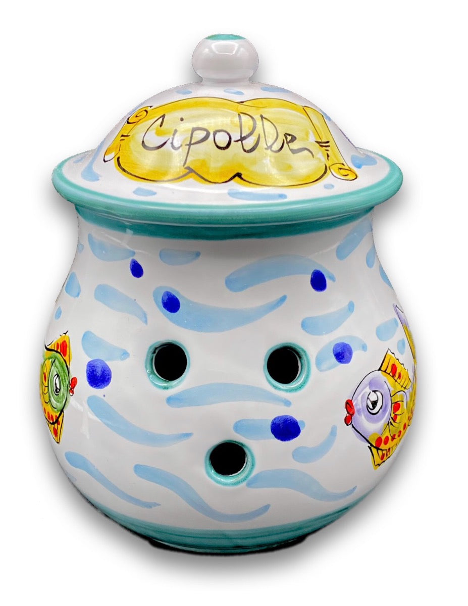Barattolo forato in ceramica vietrese, ideato per conservare le cipolle in cucina, realizzato a mano grazie alla maestria di artigiani ceramisti che fanno del “made in Italy” la loro passione.