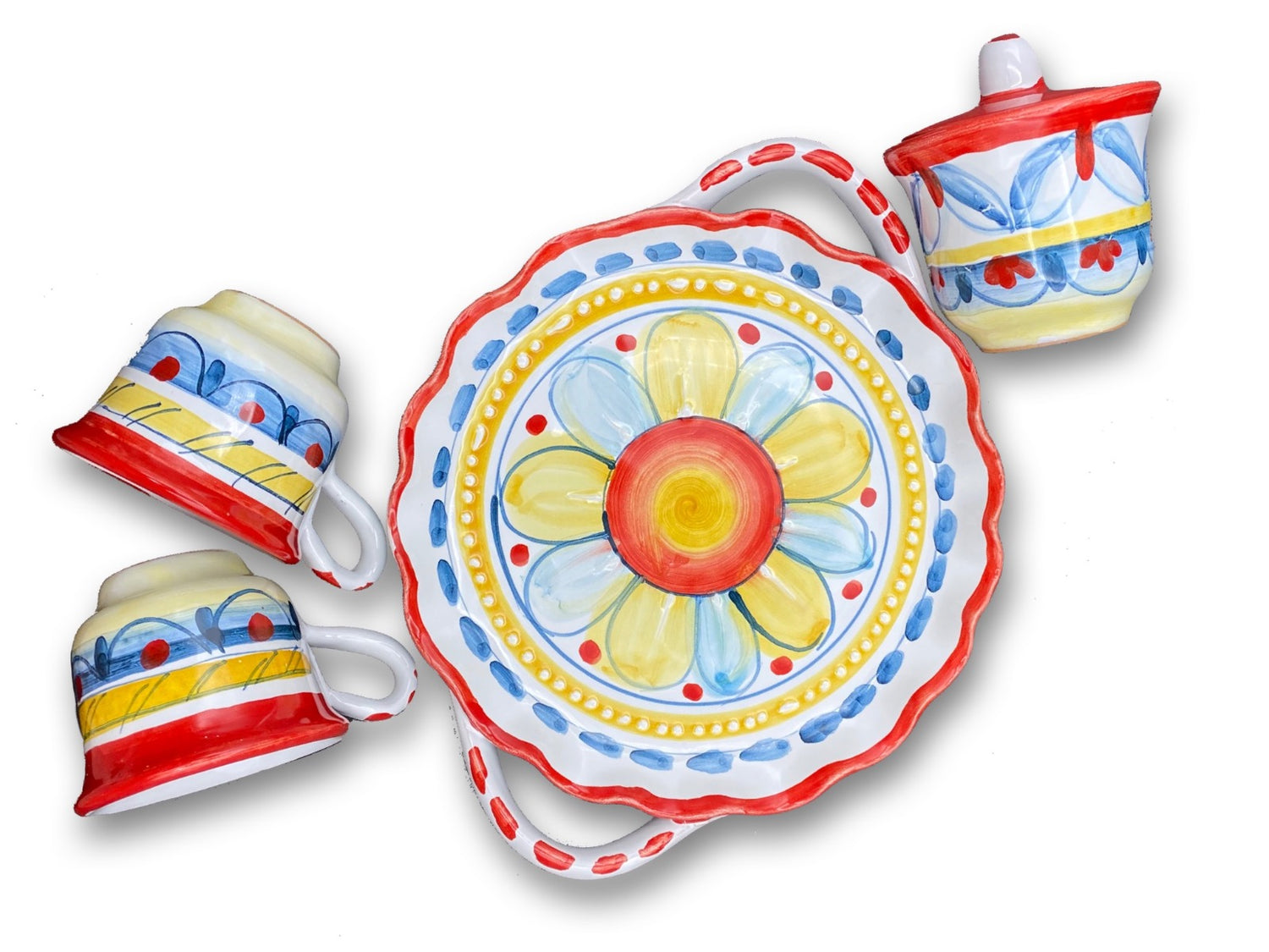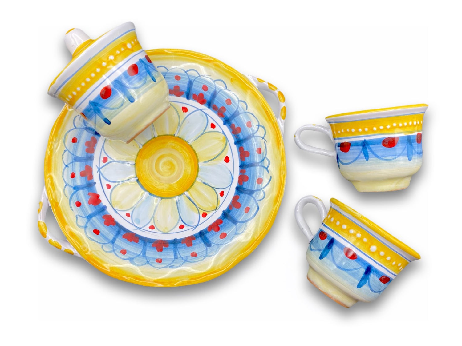 Set composto da due tazzine da caffè con vassoietto e zuccheriera abbinati in ceramiche di Vietri, tutto realizzato e decorato interamente a mano da esperti ceramisti italiani.