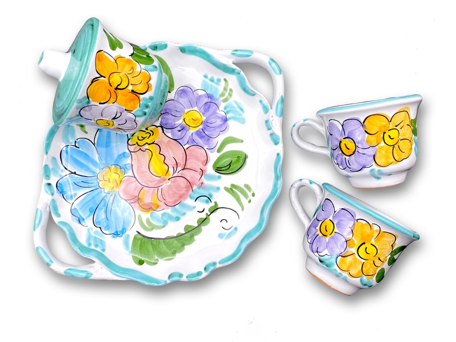Set composto da due tazzine da caffè con vassoietto e zuccheriera abbinati in ceramiche di Vietri, tutto realizzato e decorato interamente a mano da esperti ceramisti italiani.