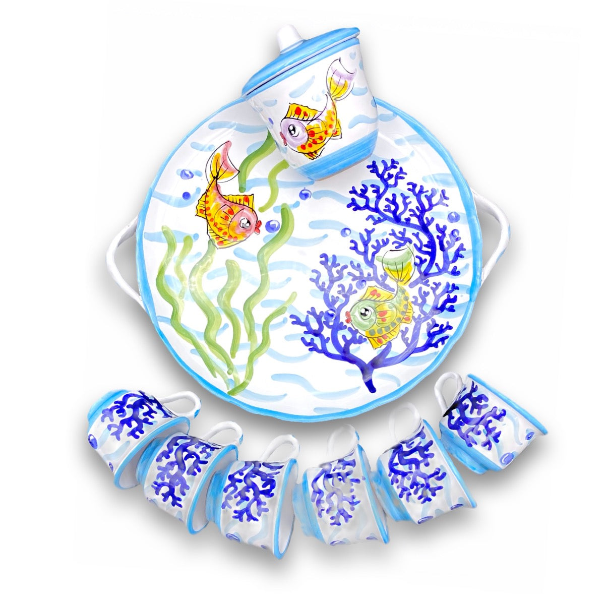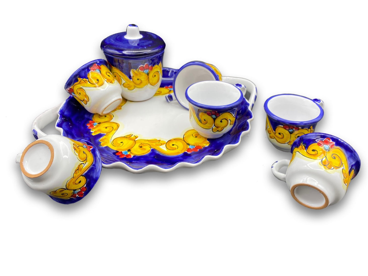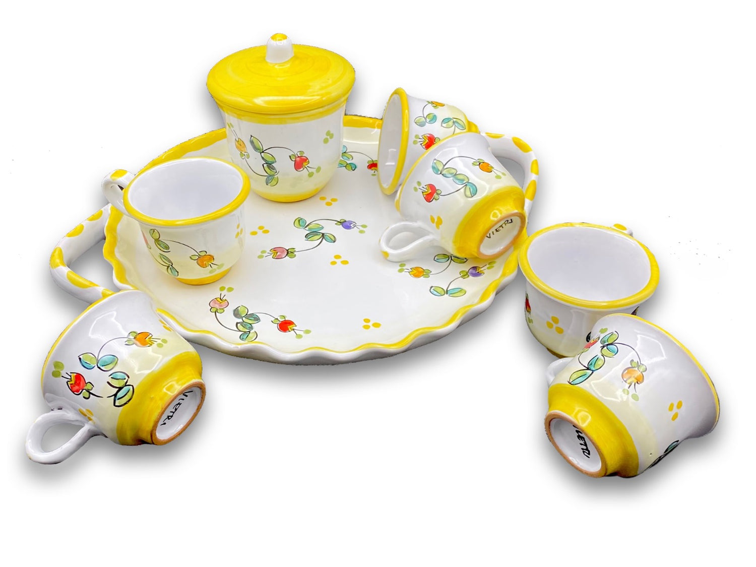 Set composto da sei tazzine da caffè con vassoietto e zuccheriera abbinati in ceramiche di Vietri, tutto realizzato e decorato interamente a mano da esperti ceramisti italiani.