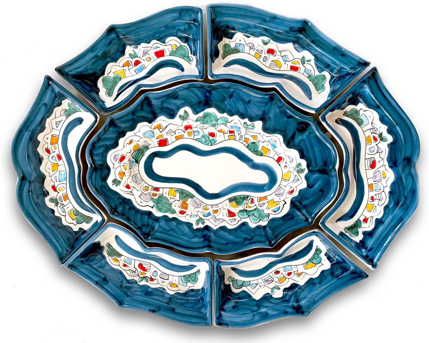 Antipastiera in ceramica vietrese decorata a mano formata da un blocco centrale e 6 parti aggiuntive a contorno.