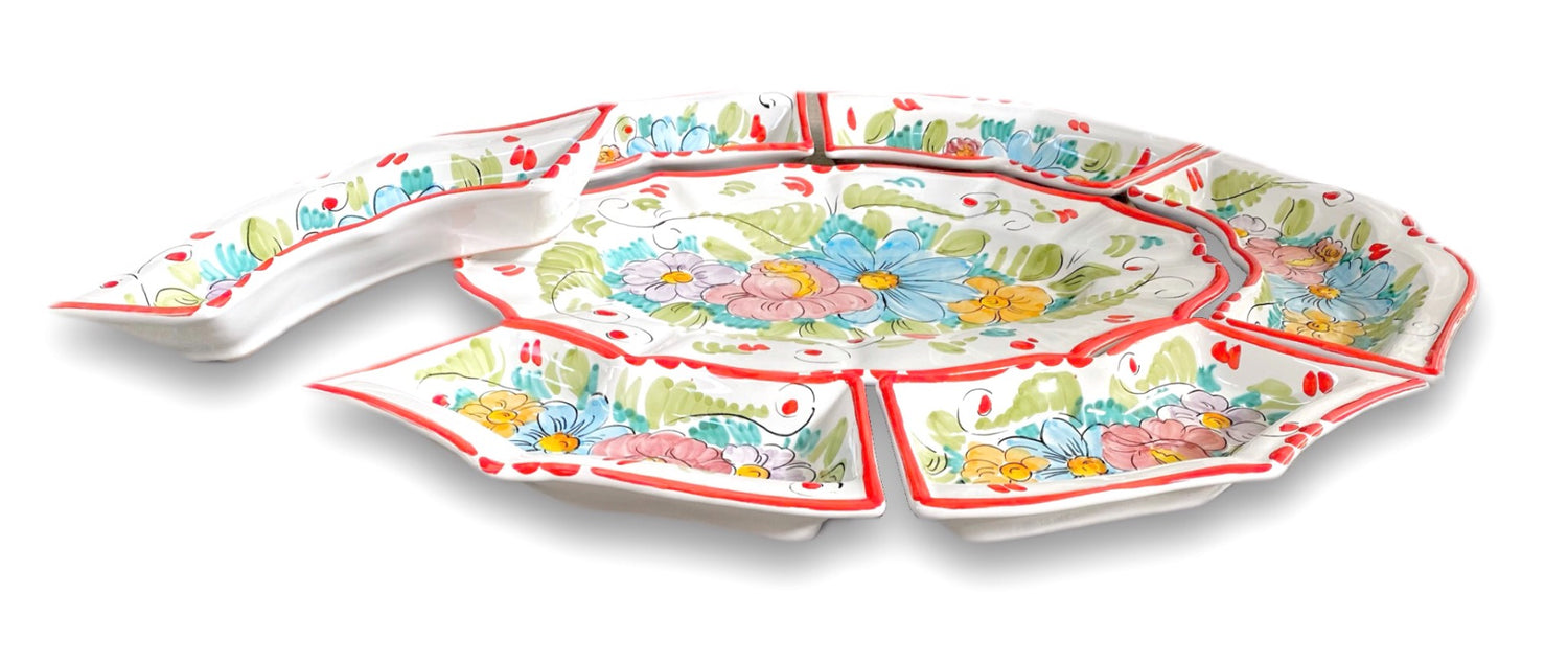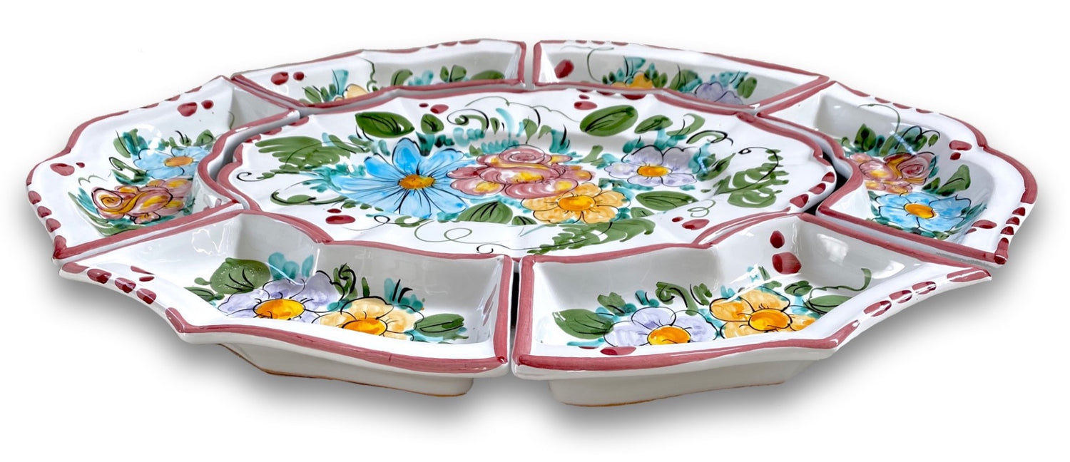 Antipastiera in ceramica vietrese decorata a mano formata da un blocco centrale e 6 parti aggiuntive a contorno.