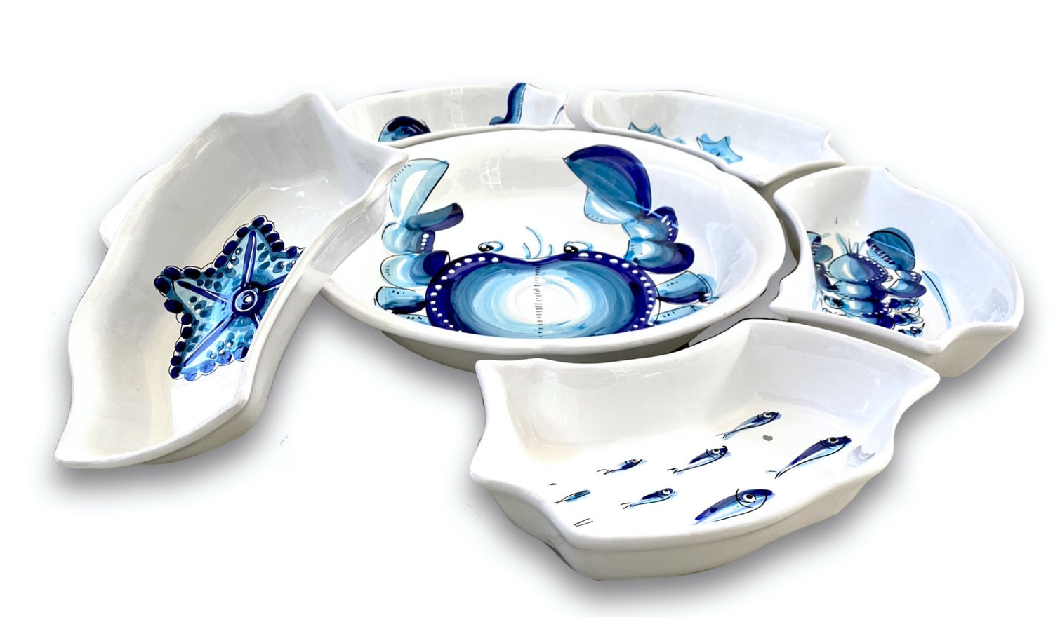 Antipastiera in ceramica vietrese decorata a mano composta da un piatto centrale e 6 parti aggiuntive a contorno, formando così la forma di un meraviglioso fiore!