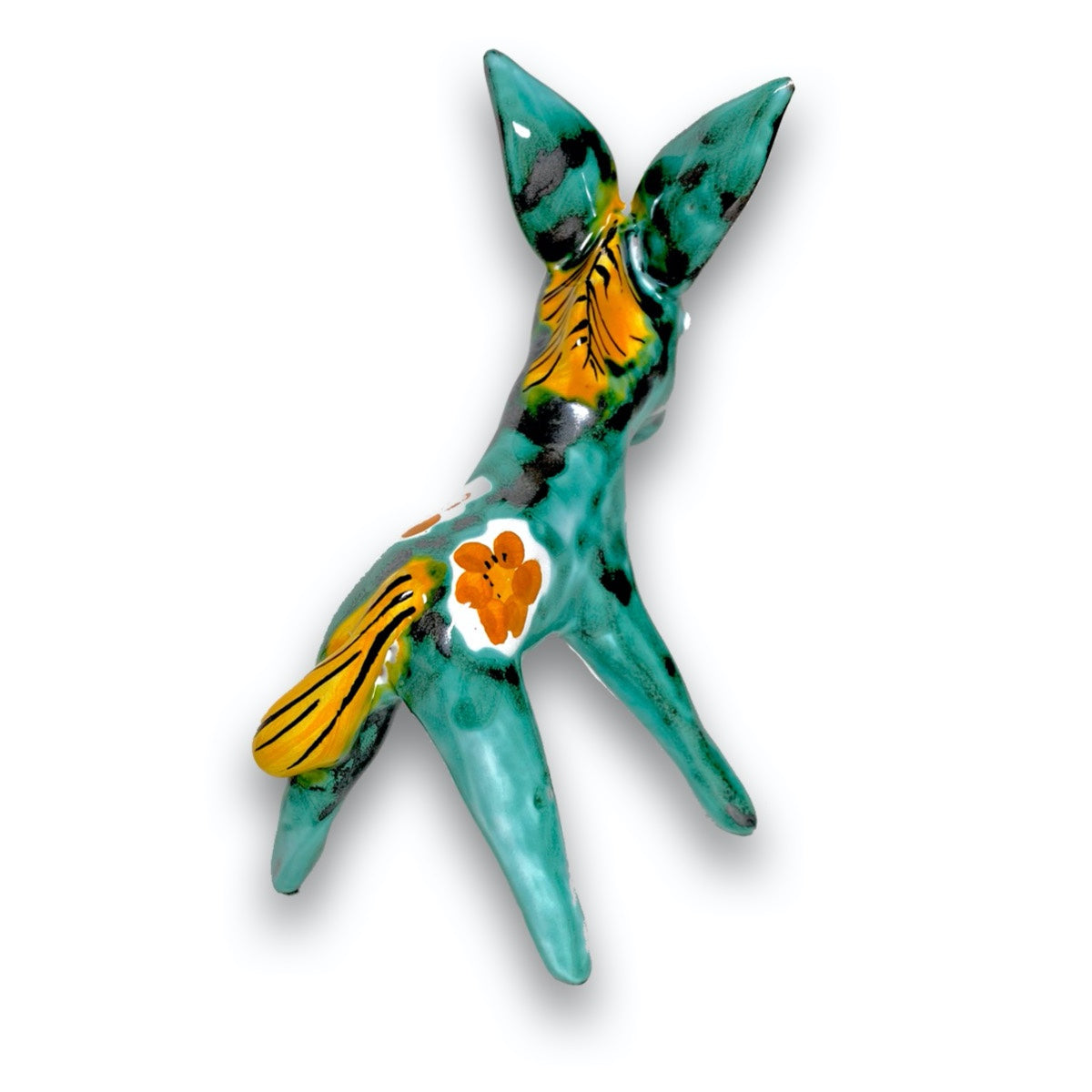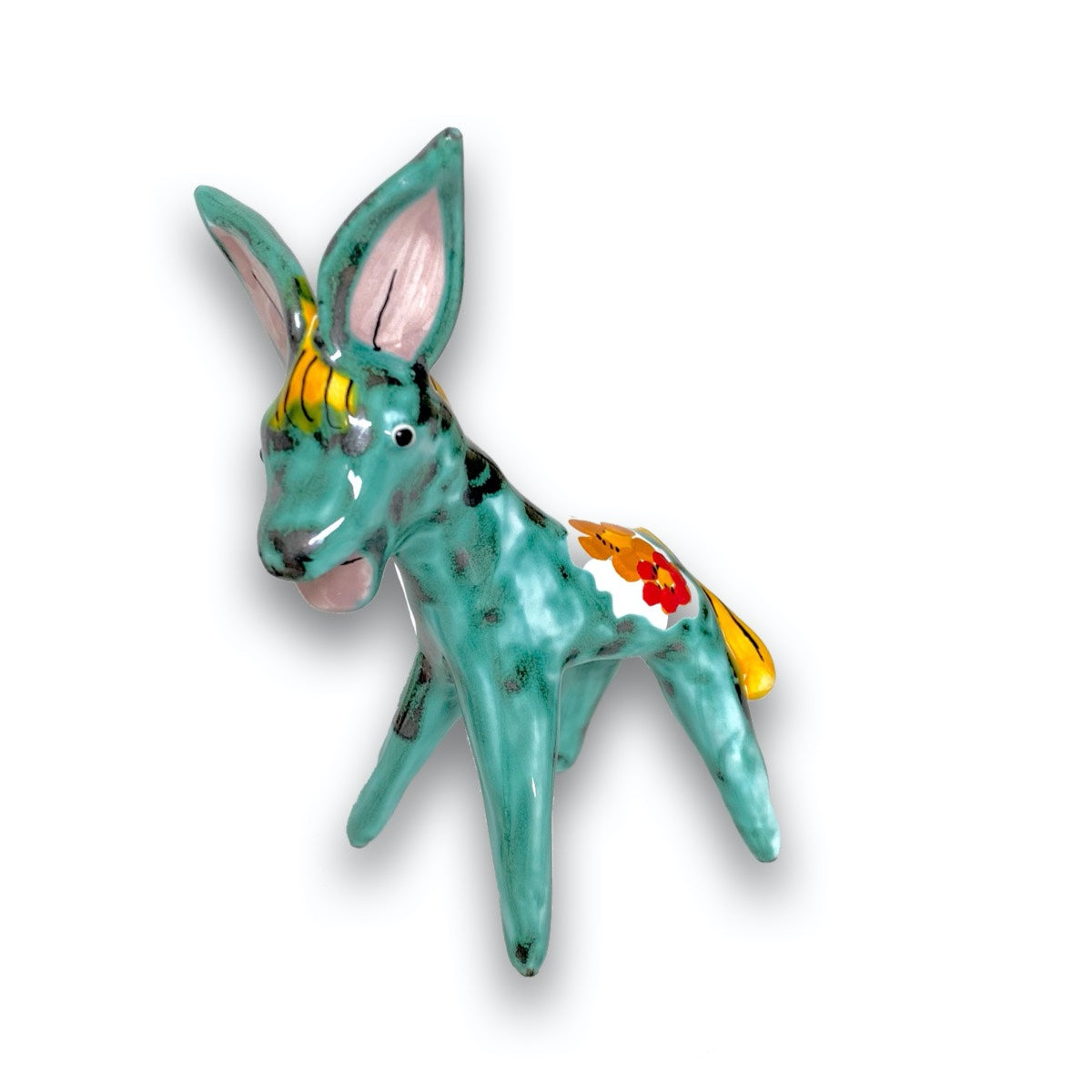 Piccola scultura del tipico asinello in ceramica vietrese, decorata a mano grazie alla maestria di artigiani ceramisti che fanno del “made in Italy” la loro passione.