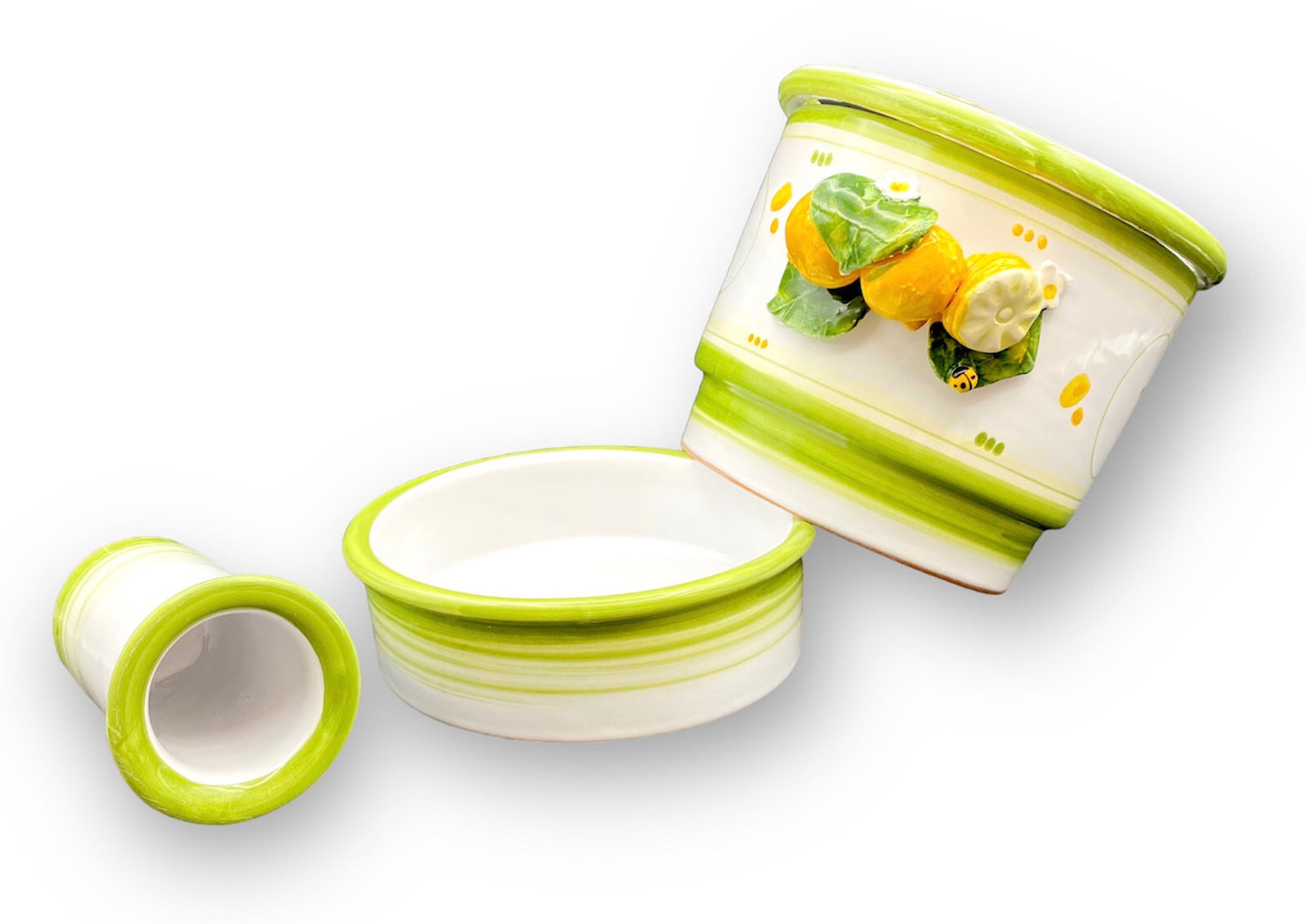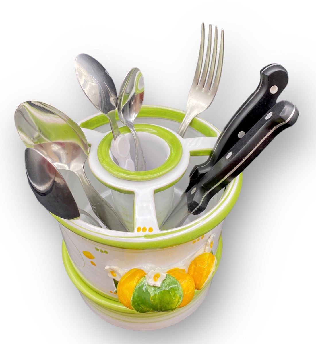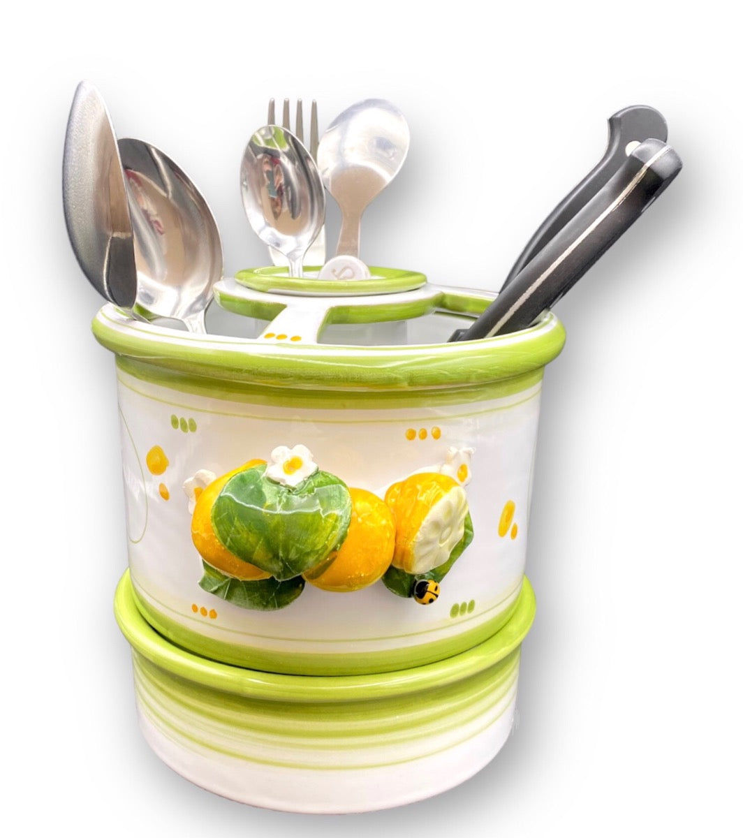 Set composto da due pezzi, un contenitore aperto per le posate ed una vaschetta sottostante per raccogliere l’acqua che cola… il tutto sempre realizzato a mano da esperti ceramisti italiani.