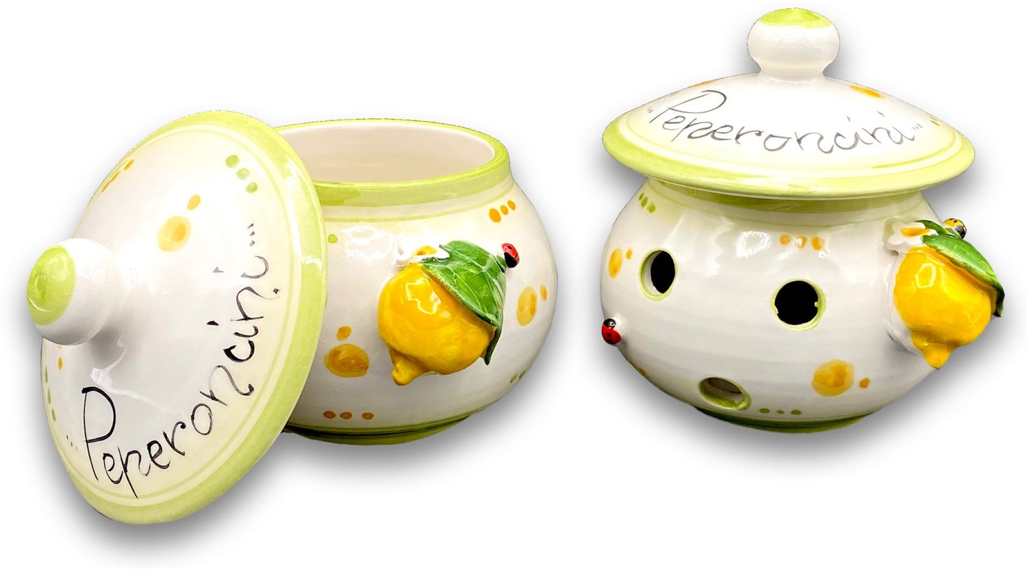 Barattolino forato in ceramica vietrese, ideato per conservare i peperoncini piccanti in cucina, realizzato a mano grazie alla maestria di artigiani ceramisti che fanno del “made in Italy” la loro passione.