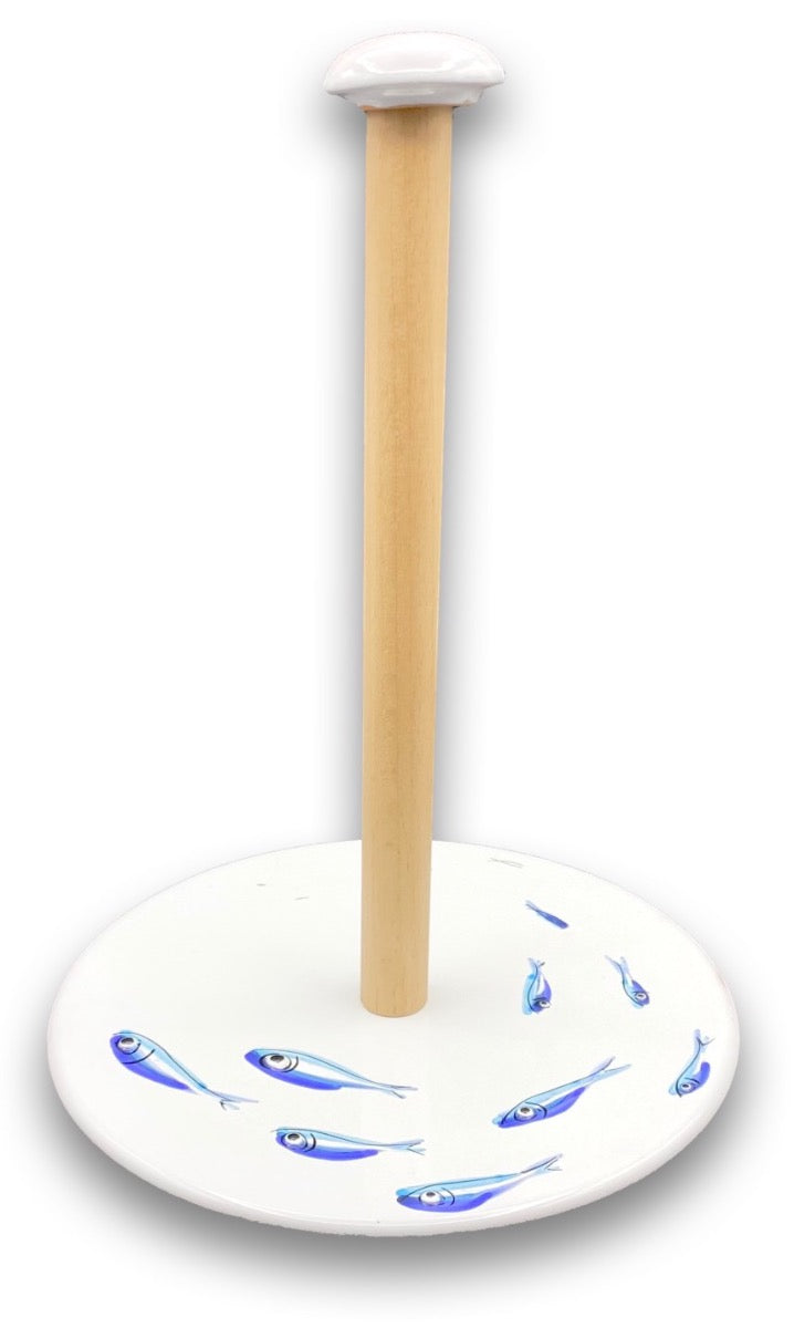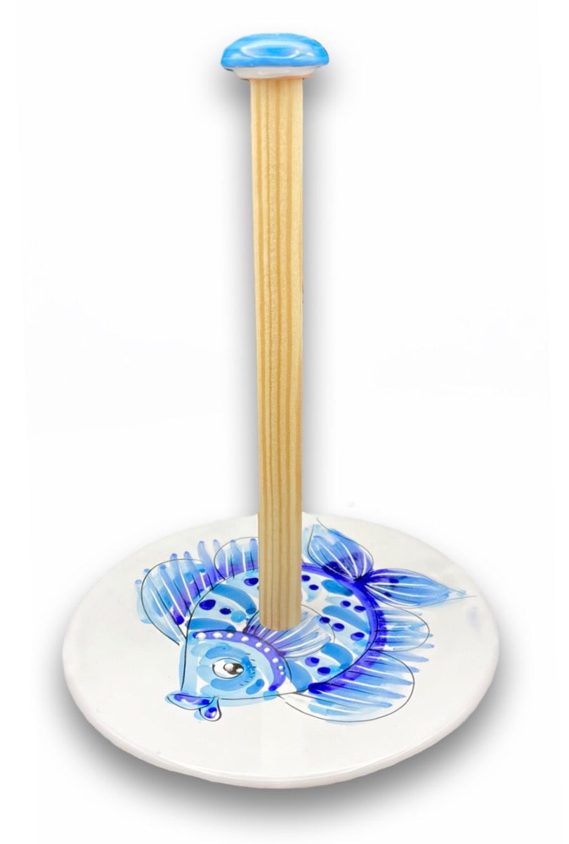 Porta rotolone asciugatutto in ceramica vietrese dotato di asta in legno, finemente realizzato a mano secondo le famose tecniche della viva tradizione ceramista italiana.