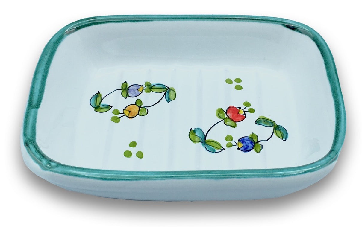 Piattino rettangolare porta saponetta, decorato completamente a mano secondo la tradizione ceramista di esperti artigiani italiani.